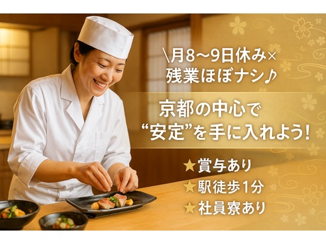 京都の中心・寺町通で“京の味”を届けるホテル調理スタッフ募集!月8〜9日休み&残業少なめで無理なく働ける環境です。駅徒歩1分の好立地で通勤ラクラク♪賞与・昇給・住宅手当・寮完備など待遇も充実!京都の伝統と観光を支えるやりがいのあるお仕事です。