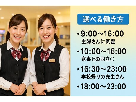 授業やサークルで忙しいけど…お小遣いもしっかり稼ぎたい!それなら週末だけ遅番勤務はいかがですか?もちろん、平日のみ勤務もオッケーなので子育てママさんも安心!未経験歓迎!扶養内勤務も大歓迎!