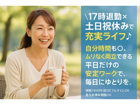「子育てしながらしっかり稼ぎたい!」そんな方にピッタリのお仕事です!「完全週休二日制「土日祝休み」「17時退勤」子育て世代に最適だから女性比率はナント80%以上!平日の学校行事での休みもOK!育児に理解のある職場で時給1400円は条件ヨスギですよね!
