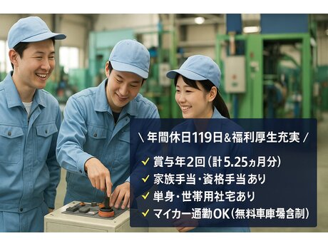 「未経験から正社員で安定して働きたい」「手に職をつけて長く活躍したい」そんな方にピッタリのお仕事です!月給20万円以上スタート+賞与年2回(計5.25ヶ月分)で収入も安心◎家族手当や資格手当など福利厚生も充実しており、20代30代の若手スタッフが多数活躍中!機械の操作やコツコツ作業が好きな方ならすぐに馴染める環境です!