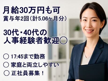 「総務や人事の経験はあるけどブランクが心配」「そろそろ腰を据えて働ける職場を探したい」そんな方もご安心ください!世界シェアNo.1の大手グループ企業で、あなたのこれまでの経験をしっかり評価◎月給33万円可+賞与5ヶ月分支給ありで、年収500万円以上も目指せます!土日休み×年休121日で家庭との両立も叶いやすく、食堂無料や家族手当など福利厚生も充実!落ち着いた職場環境で同世代も活躍中◎転勤はほぼなく