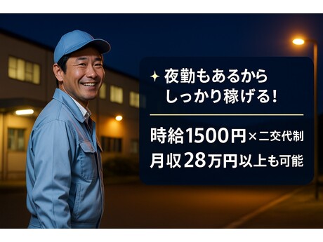 「安定した収入を得たい」「将来は正社員を目指したい」そんな方にピッタリ!未経験からでも時給1500円で月収28万円以上可能◎週休2日×一週間ごとの二交代制で生活リズムも安定。工場見学や丁寧な研修があるので初めての方も安心してスタートできます!