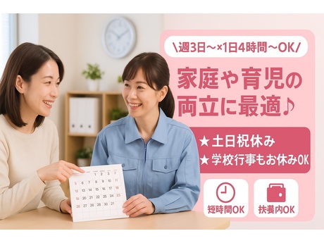 「接客業はちょっと...」「家事と両立して働きたい」という方にピッタリのお仕事です!土日祝休みで週3日~1日4時間~OKの工場バイト!子育てや家事の間に扶養内勤務したい方に最適です!人気の検品・検査でモクモク軽作業!20代~50代までの幅広い年齢の方が活躍中!未経験歓迎!