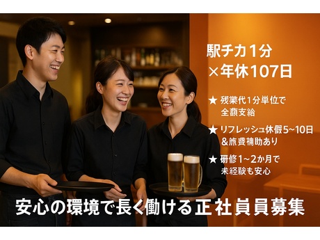 大手グループの居酒屋で、未経験から店長を目指せる正社員募集!月給24.5万円~+賞与年4回で安定収入を確保しながら、充実の研修制度で安心スタート。キャリアアップ制度も整っており、店長やエリアマネージャーへのステップアップも可能です★駅チカ徒歩1分の好立地で通勤ラクラク、単身寮完備(家賃39,000円)で遠方からの転職も安心。残業代は1分単位で全額支給、年休107日でプライベートも安心です!