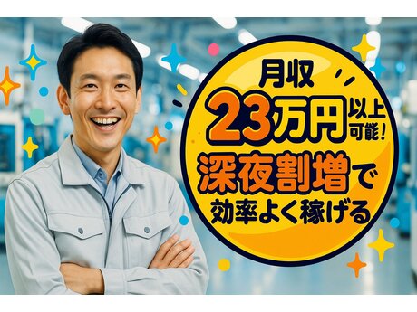 夜勤でしっかり稼げる安定ワーク!未経験でも時給1300円スタート&深夜割増で月23万円以上も可能。作業は「シートをセット→取り外す」のシンプル工程で覚えやすく、体への負担も少なめ。残業ほぼなしで予定が立てやすく、土日祝休みでプライベートも充実。バイク・原付通勤OKで通勤ストレスもなし。製造デビューにもピッタリの安定した職場です。