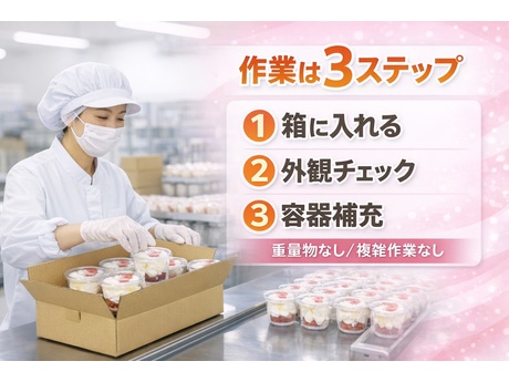 ホイップクリームなど洋菓子用商品の箱詰めと検品を担当します。作業は工程ごとに分かれており、同じ作業を繰り返すシンプル業務が中心。9時~14時固定のため生活リズムが安定しやすく、扶養内から週5日勤務まで選択可能。長期前提の募集です。