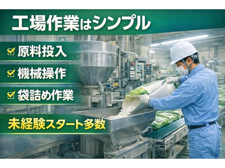 肥料製造工場で原料投入・機械操作・袋詰めなどの工程作業を行う仕事です。工場の決められた製造工程に沿って作業を行うため、製造業未経験の方でも作業内容を覚えやすい環境です。年間休日121日で休日数も多く、長期で安定して働ける工場勤務です。