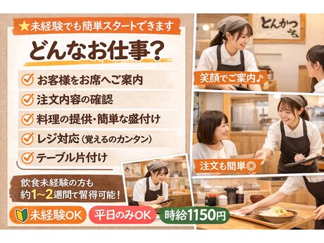 とんかつ店ホールスタッフ(時給1150円/週2日・1日2時間~/30分単位シフト)