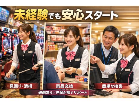 ホール巡回・清掃・簡単な接客が中心で、専門知識は不要。入社後は担当スタッフが横について業務を分解して教えるため、未経験でも15日程度で基本業務を習得可能。週2日から勤務日数を固定でき、収入と生活リズムを安定させながら長期勤務しやすい職場です。本求人は株式会社百人力の直接雇用です。業務は当社が請け負っている勤務地にて実施します。